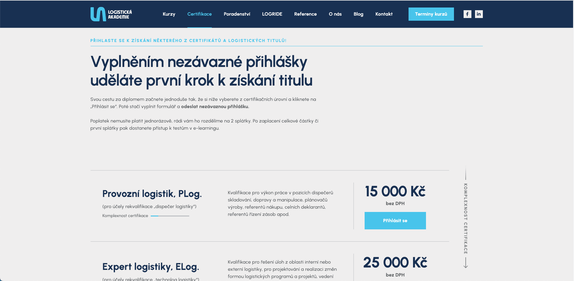 Pro Logistickou akademii jsme navrhli a vyvinuli celý webový systém včetně grafického návrhu na míru. Po schválení designu jsme přešli k vývoji, jehož součástí je pokročilá správa uživatelů a objednávek. Uživatelé si mohou zakoupit kurzy a certifikace přímo na webu, přičemž celý proces nákupu a administrace je automatizovaný. Unikátní funkcí je slider na hlavní stránce, ve kterém může klient nastavit procentuální pravděpodobnost zobrazení jednotlivých obrázků – tím má plně pod kontrolou vizuální stránku své prezentace.